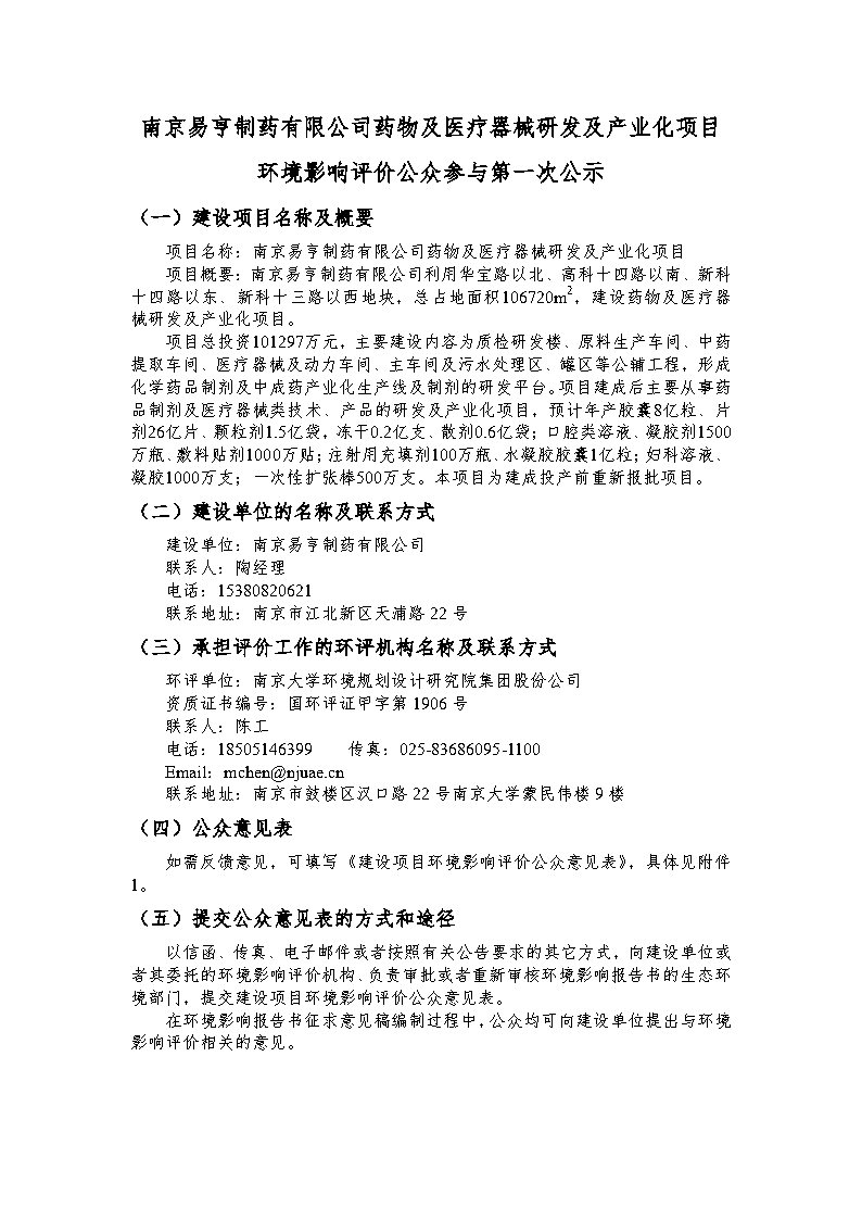 藥物及醫(yī)療器械研發(fā)及產(chǎn)業(yè)化項目 環(huán)境影響評價公眾參與第一次公示